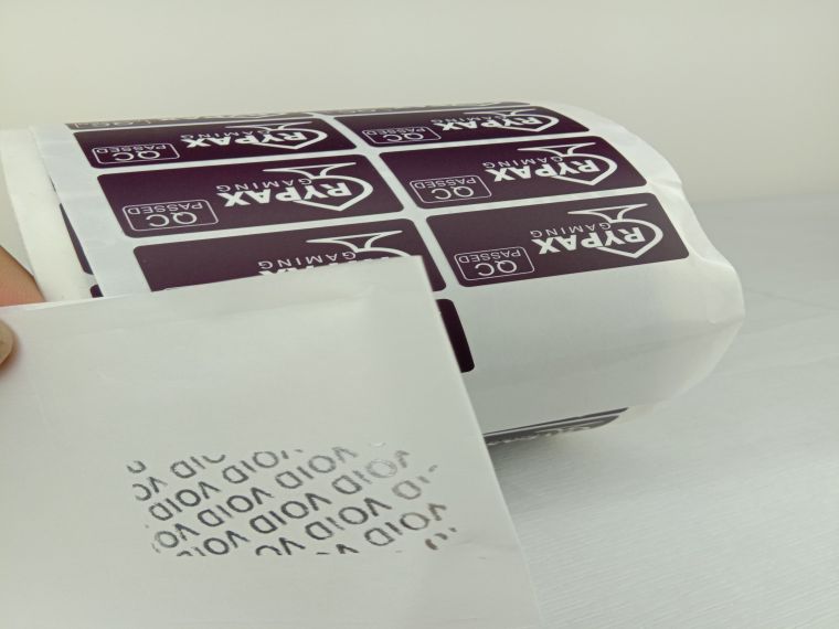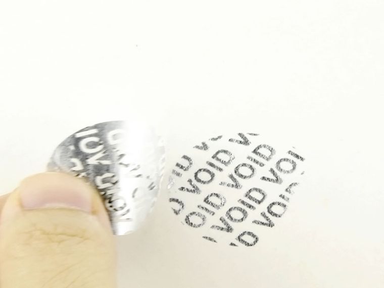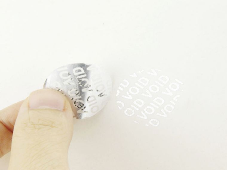 VOID防偽標簽特質:揭開標簽后,被貼物上會留下預先設定好的文字、圖案、標識等內容,與標簽的破壞部分呈陰陽對稱;